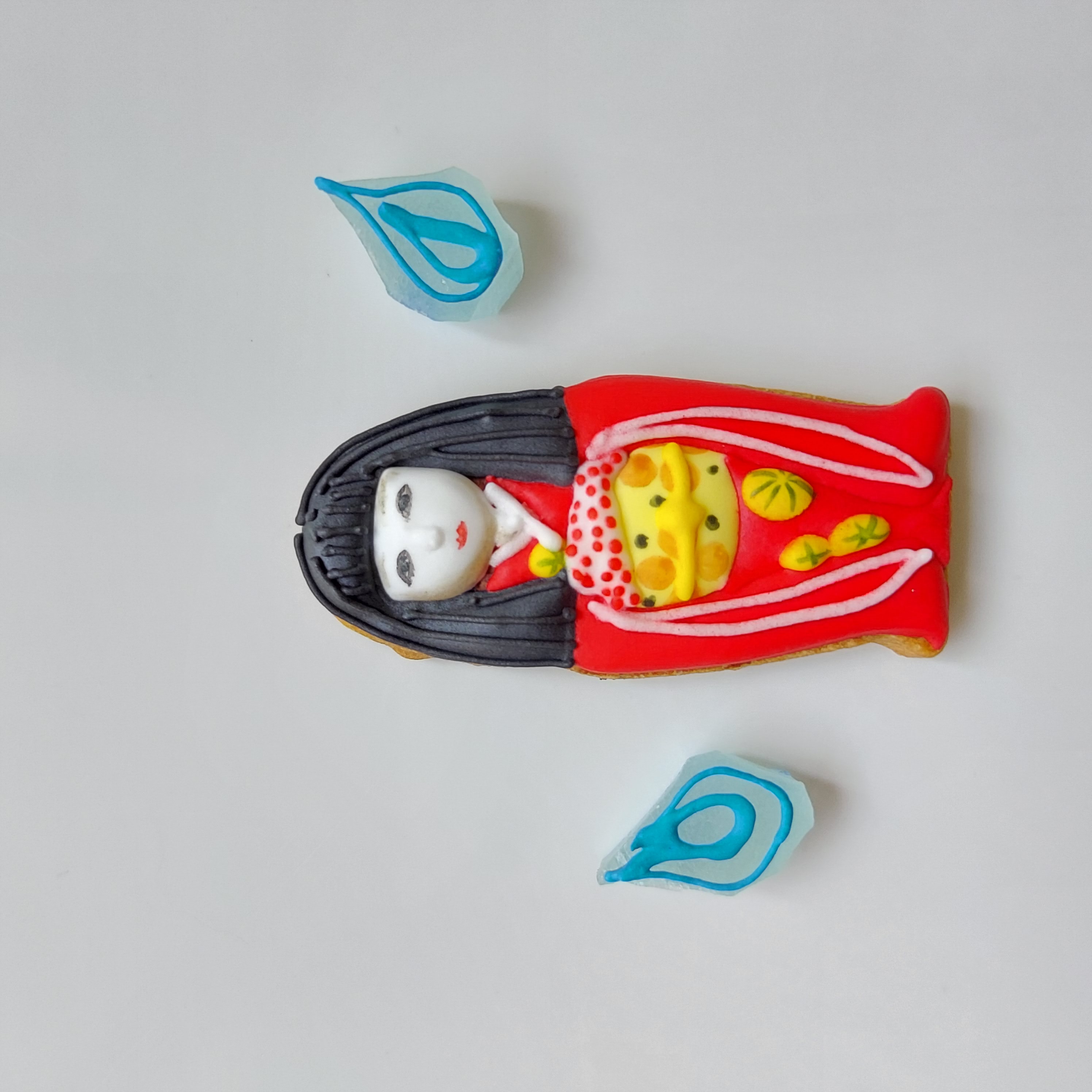 ちょっぴり不気味さ漂う市松人形のアイシングクッキーと人魂のこはくとうのセットです。
